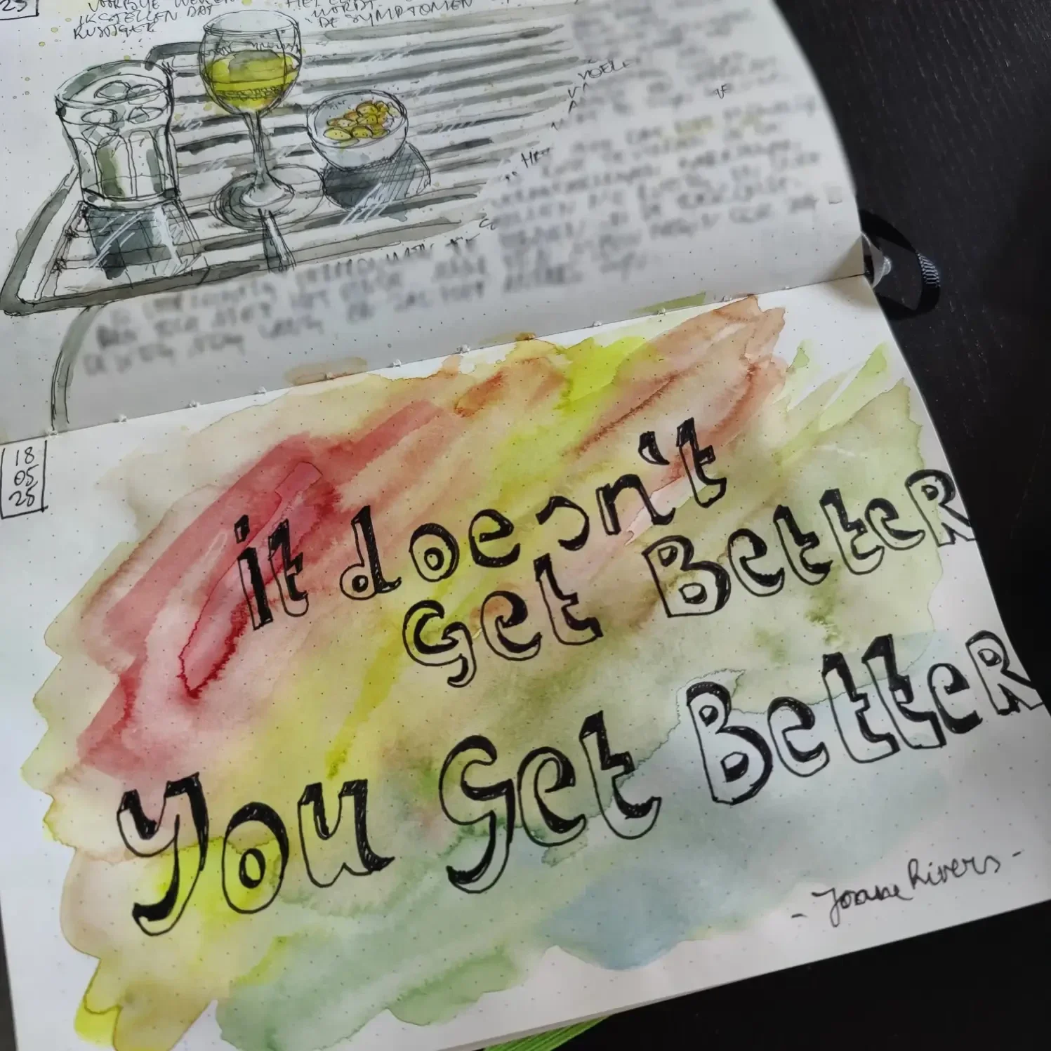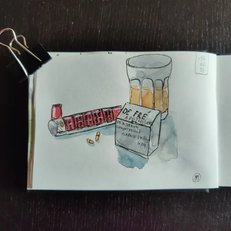 Het schetsen helpt me om terug te keren naar het hier en nu. Het mindful aspect van het opnemen van wat je ziet en voelt, en dat omzetten in een creatief beeld, biedt mij een perfect rustmoment. Het stopt mijn denken en piekeren, en tegelijkertijd kan ik mijn creativiteit kwijt zonder dat ik tegen mijn fysieke en cognitieve grenzen aanloop. De rust die het mij zowel fysiek als mentaal brengt, is echt een win-win.